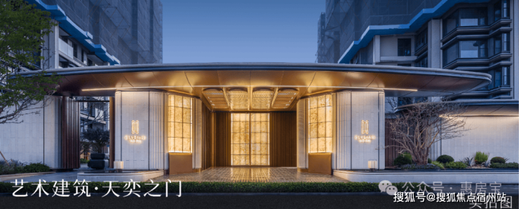 主人口从雅典One&Only度假酒店汲取灵感,打磨温润弧线,赋予舒缓、松弛、艺术的归家氛围;入户大门以浅色石材、波浪线条,搭配暗金色金属面,演绎金镶玉”的新奢门庭。在棕榈树阵、下沉式庭院、镜面池畔卡座的对景中,成为未来沉浸自然的惬意之地。温柔闲适的落日廊吧,犹如身处海岛之畔,感受蓝调时刻的优雅情调。