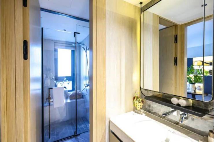 其他卫生间均 通顶铺贴岩板,配备杜拉维特台下盆、汉斯格雅暗装龙头及花洒,让每位家人都能拥有专属的洗漱空间,避免早晚高峰的拥挤。