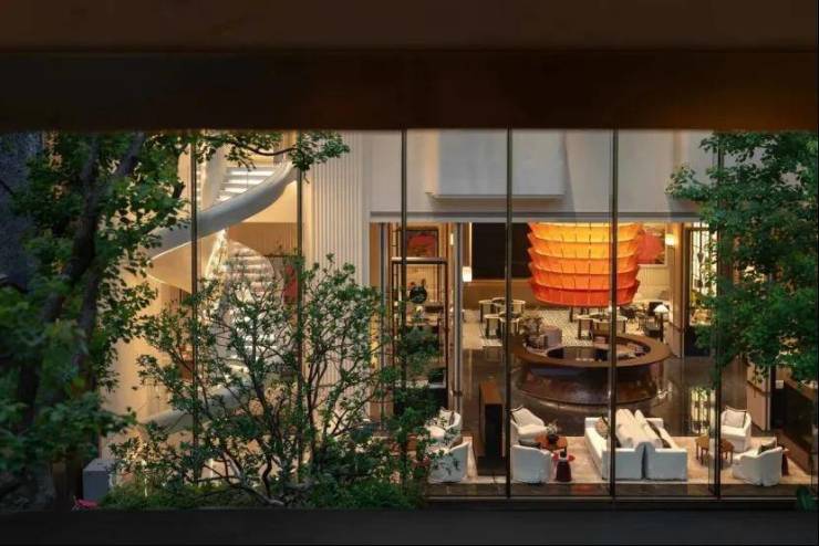另外,水吧的一侧就是约10米高的落地玻璃,可以看到窗外下沉式庭院花园的美景,约6米的山石瀑布,层叠的流水,珍贵品种的树木……“复得返自然”的感觉,油然而生。