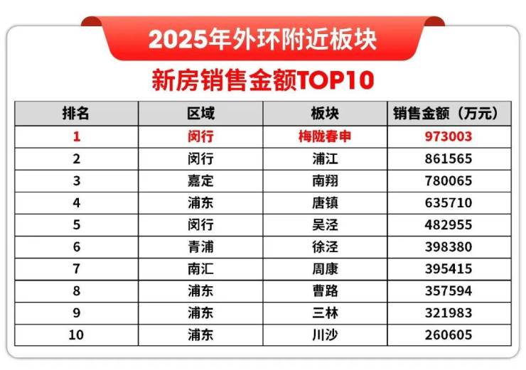 据网上房地产网签数据统计,2025年至今外环附近各大板块横向对比,梅陇春申板块以超97亿的成交金额荣登销冠宝座,力压南翔、唐镇、徐泾、曹路一众热门板块。