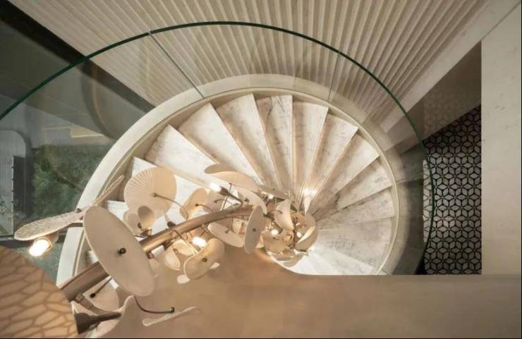 建面约170㎡户型的1楼入户大堂也非常气派,地面是大理石拼花,墙面是花岗岩,弧形吊顶+隐藏射灯,整体形成了低调隐奢的感觉。