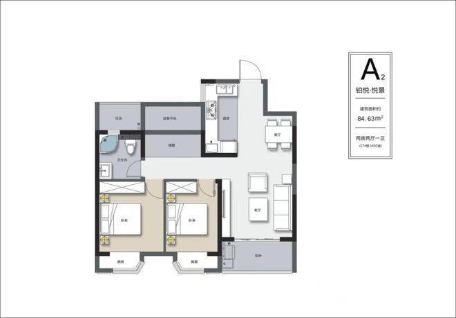 A2户型面积约84.63㎡,全天有采光,视野非常好。整体户型方正,符合国人居住习惯,全明设计,三开间朝南,保证了通风和采光,并且动静分离,也是市场需求最大的3房。约6㎡南向观景阳台,主卧和次卧都是朝南设计,且都有飘窗,入住非常惬意舒适。