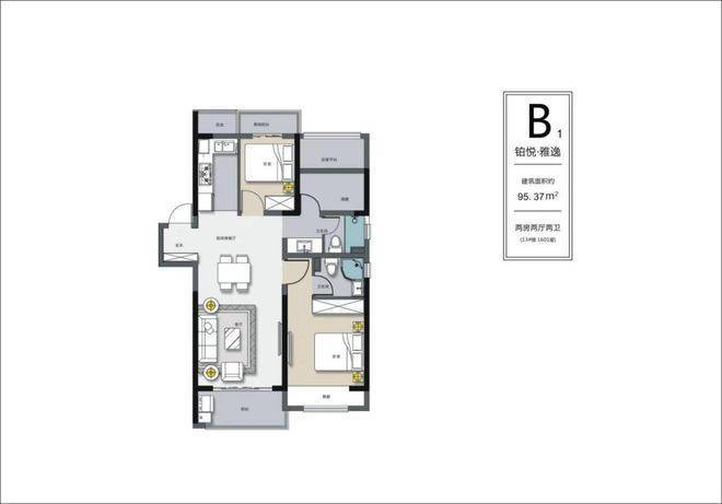 边户B1户型面积95.37㎡,户型方正,南北通透,双开间朝南。进门为玄关设计,增强公共空间的私密性。阔绰南向客厅,局部面宽约3.6米,采光十分通透。此户型最大亮点为南北双阳台的设计,北面增加了一个功能性阳台,可用于放置洗衣机等大型物件,提高了生活舒适度的同时也提升了住宅档次感。