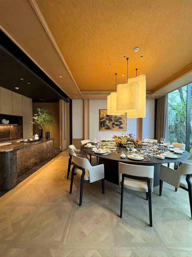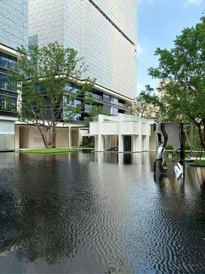 园林设计上则更偏酒店化,以希腊安缦卓熠为灵感,整个核心区园区以约900方的无界中央水景为主体。穿过大门后,约900㎡的无边界水景豁然眼前,建筑、回廊与树丛仿佛凌波而立。正如“美人在骨不在皮”,无需繁复修饰,大尺度空间、开阔水院与大面积玻璃自成画布,任自然光挥洒,这才是内蕴的性感。最是没的是在11号楼架空层的邻里中心——窗沿与水院浑然一体,桌案几乎与水面持平,微风拂过,涟漪便从眼前漾开。庭院里的丛生乌桕,不事雕琢,保留原生枝条的疏朗与错落,尽显自然之美。
