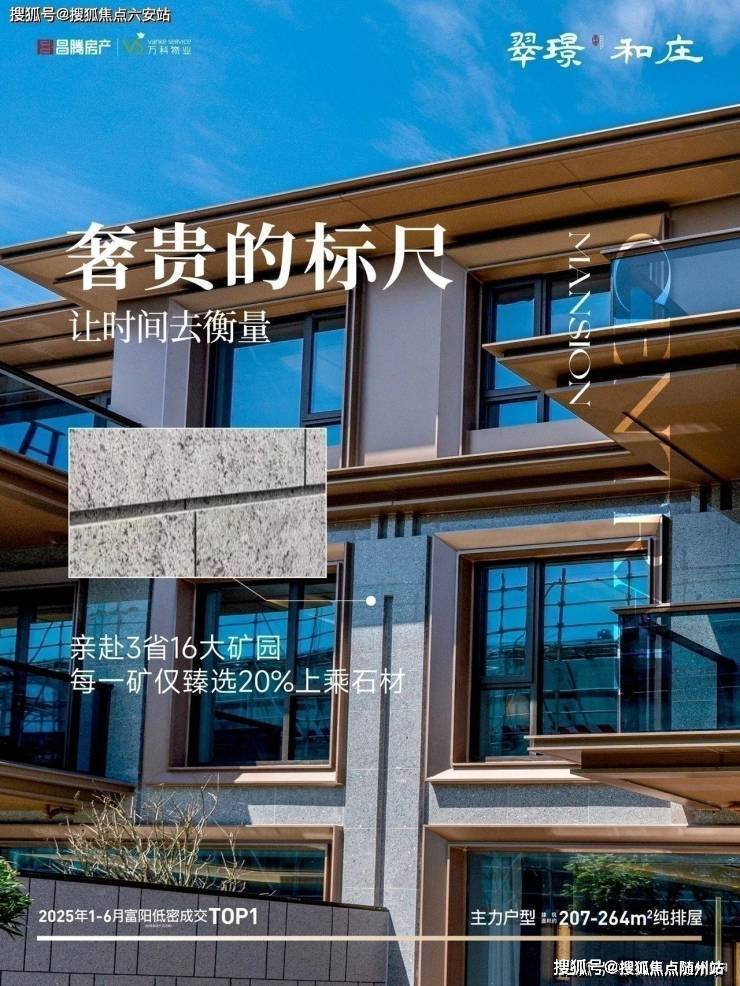 翠璟和庄在建材选择上毫不妥协,彰显出高端住宅的品质追求。项目 外立面主材质采用伊朗进口的“蓝眼睛”石材 ,与杭州某2000万级排屋是同款石材,搭配四面干挂铝板,厚重感扑面而来。