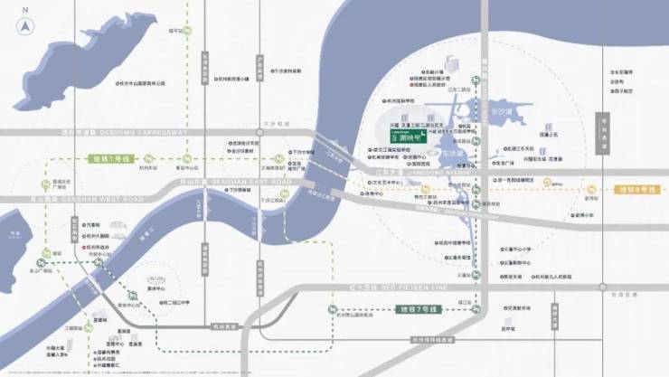 地铁7号线启成路站(已通车):项目东侧800米左右即为7号线启成路站,途径五个站点到达萧山机场、约半个小时可到达奥体、钱江新城、吴山广场等重要行政及商业区域。 地铁8号线(已通车):青西三路站,无缝衔接核心区与下沙开发区,换乘1号线可通往杭州东站、武林商圈、西湖、滨江等重要区域。