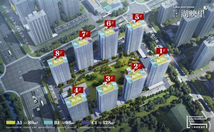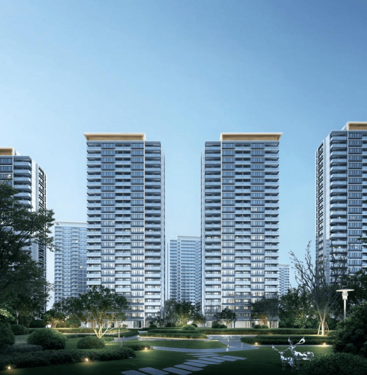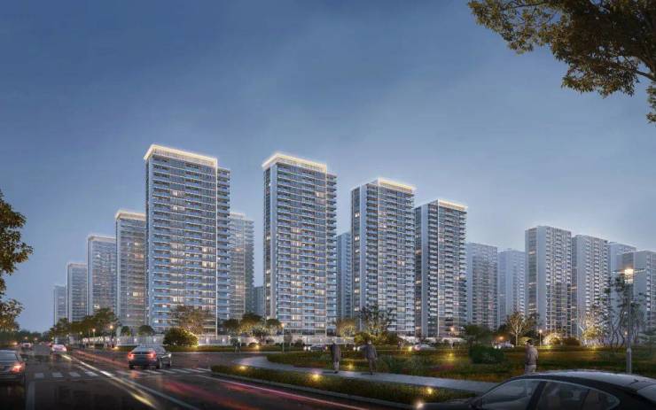 8栋高层建筑呈 大围合布局,每一栋都在 四面大面积铝板建筑立面、外墙 三玻两腔LOW-E玻璃的基础上,注入崭新设计灵感, 顶部暖色“皇冠”格栅,打上了湖畔高颜值标签。
