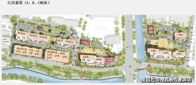 设计中将7个独立的地块与滨水空间相结合, 通过对商业、绿化、广场界面的有机穿插、整合成为一个与景观河道交相辉映、有节奏的公共长廊,提升滨水区域的环境品质。