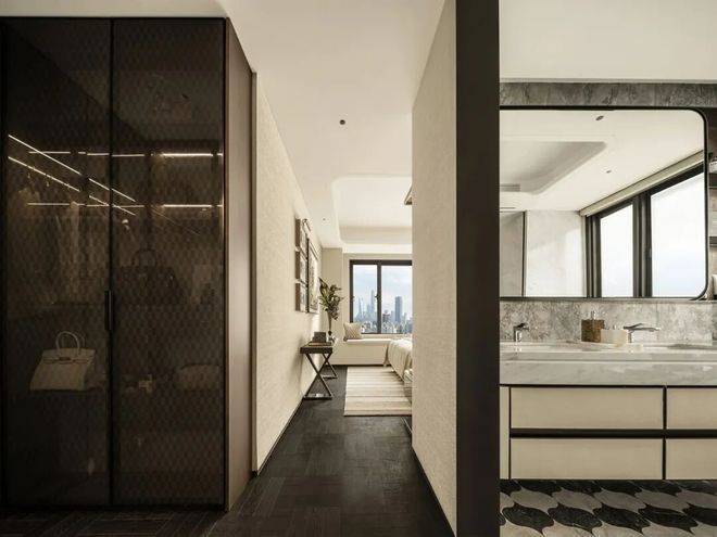 主卧套房中,非遗云纹立体墙布嵌入皮革背景,顶级爵士白奢材,艺术玻璃夹丝柜门,书香门第实木地板以回形纹路延伸雅致。主卫空间以鱼肚灰大理石与博雅白台面精工对拼,防水防潮皮革,香奈儿灰与星耀灰石材拼花地面,升级独立浴缸与尺度双台盆,营造艺术馆般的奢享境界。