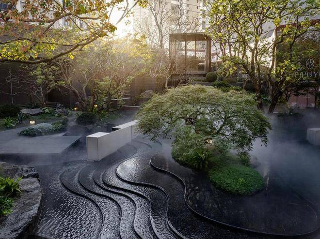 凭借约14米天然高差,以突破性的立体营造手法,将山川、溪谷、林泉的意象层层织就。近2000㎡实景下沉庭院,在都市中央展开一幅可游、可赏、可居的立体山水长卷,三境九韵至此呈现,东方美学步入全新表达维度。