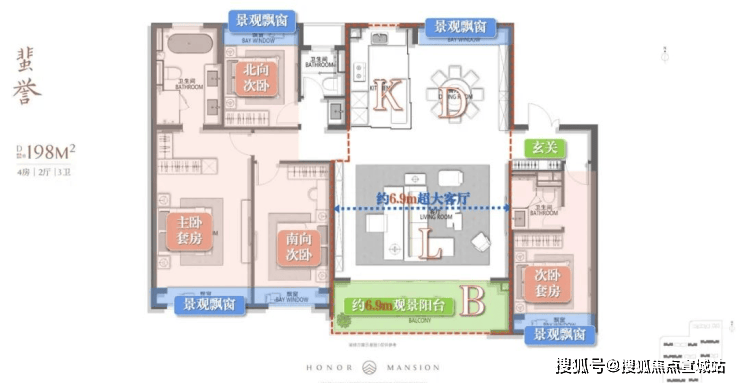 餐客厅阳台组成LDKB超大社交方厅,近80㎡的奢阔,约6.9m的客厅加上三个卧室,近乎是5开间朝南。