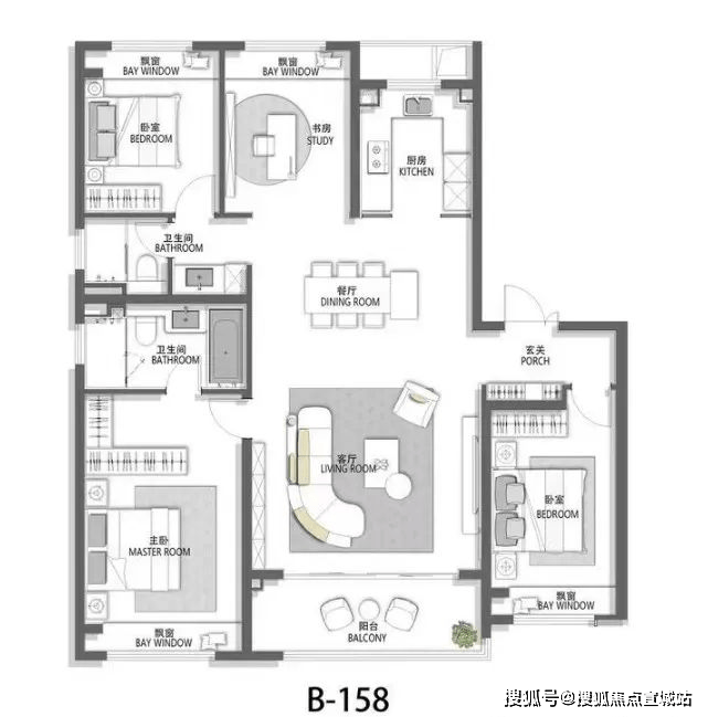 同样是5开间朝南,南向面宽拉升至约21m!甚至阔气到将两个次卫都放在了南面,3卫全明!