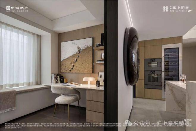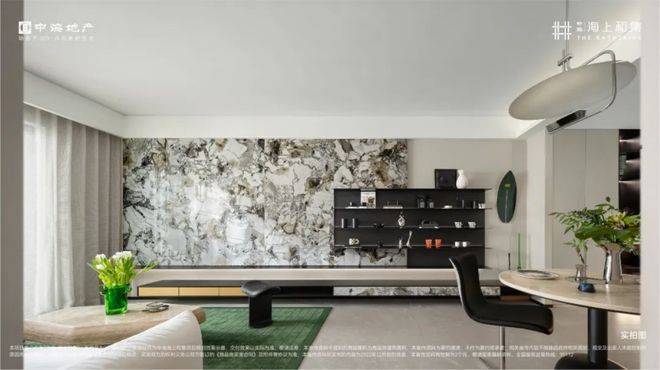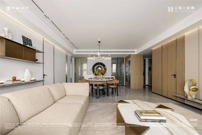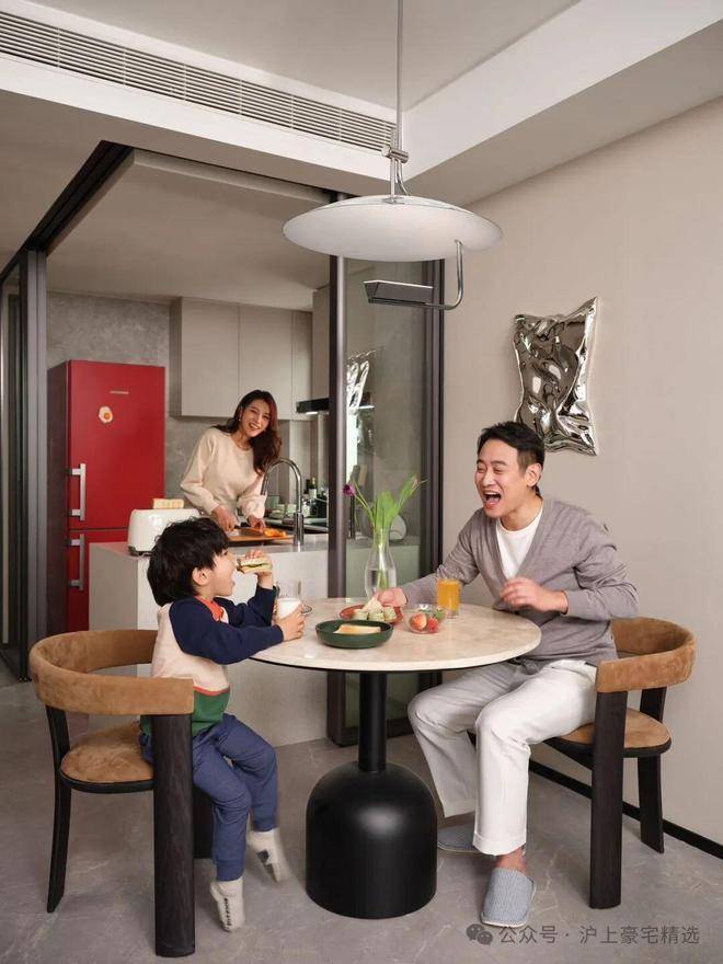 近50㎡的超大客餐厅,可以轻松容纳下岛台、中式大圆桌、沙发、电器墙等生活场景,承载阅读思考、美食分享、聚会休闲、音乐趣味等多种生活功能。