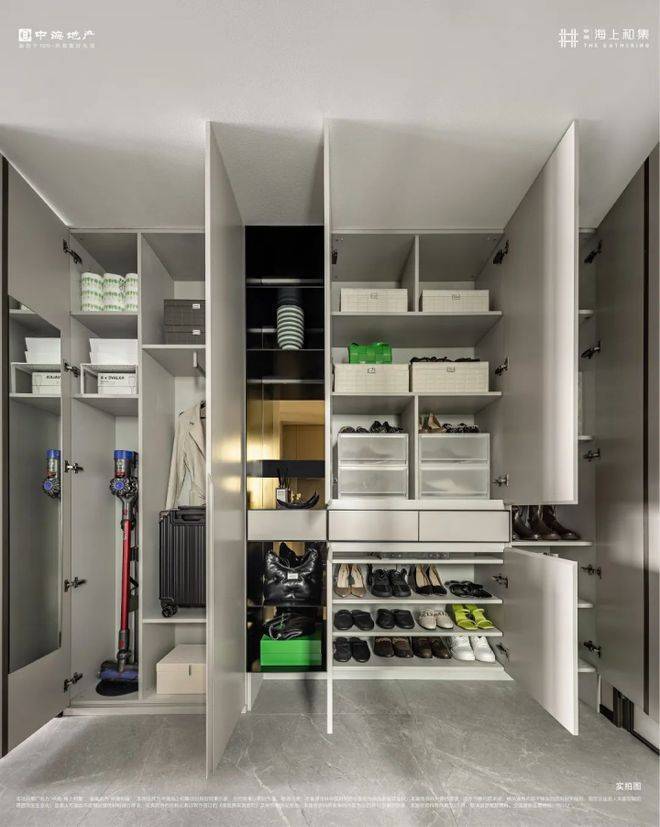 铸铝的铁门,整体约超300斤,相当于一般防盗门3-4倍,质感与安全感满满。超大玄关柜空间,约2.6m宽的超大玄关收纳,近0.4m的柜体深度,可以轻松收纳大量日常出门所需物品。