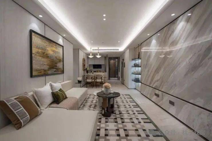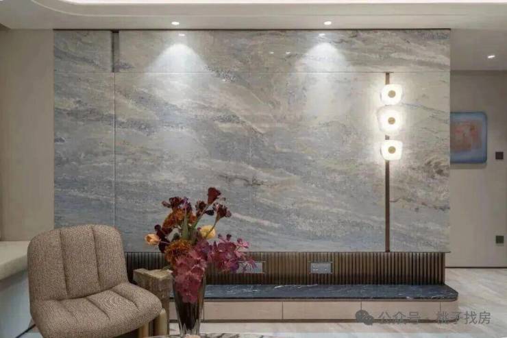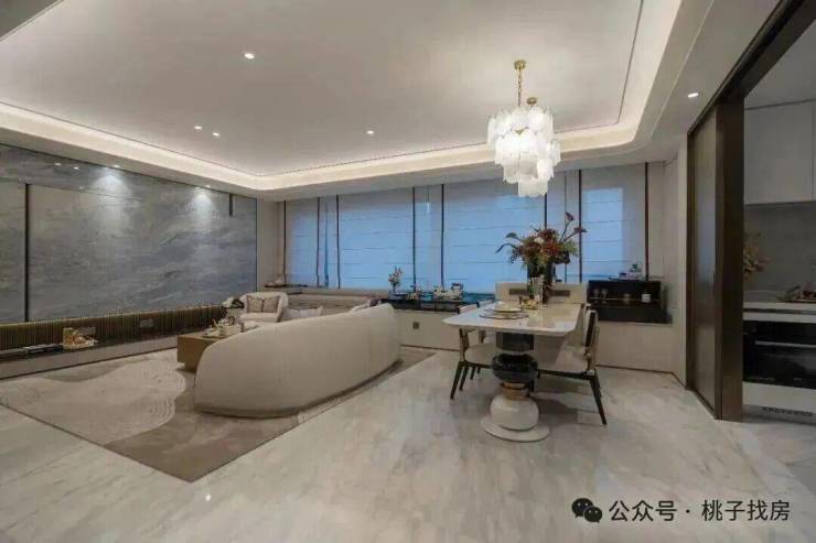 还有各种高级材料的运用,如维多利亚白石材、白玫瑰石材、地面拼花石材、土耳其雪花白石材、宝格丽黑石材、绿野仙踪岩板、贝母漆、皮革硬包等。