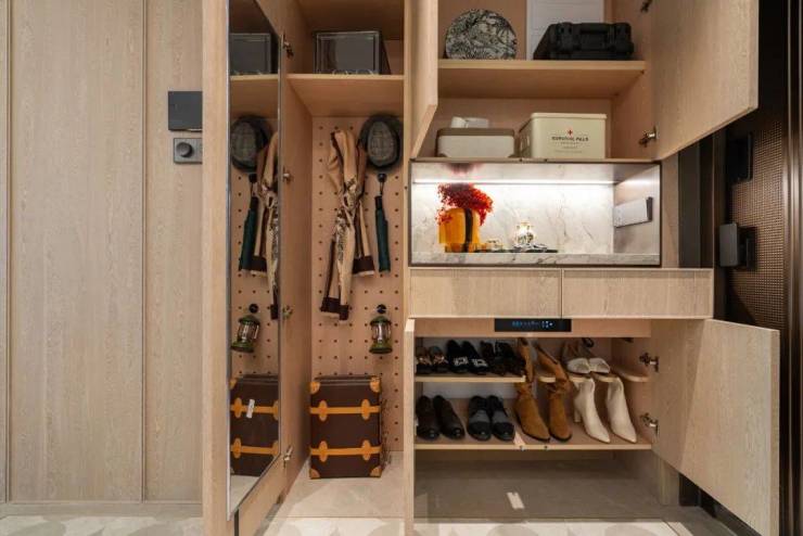玄关收纳更精细,每个格子的规划都很贴近生活,随手物件,女主人的高靴,吸尘器、扫地机器人、行李箱等都有各自安置空间。