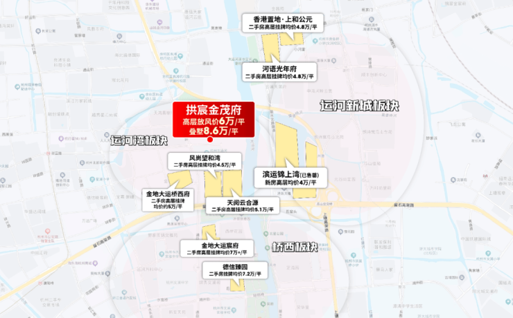 首先,可以确定一点的是,京杭大运河作为重要的城市资源,越靠近运河的小区房价会越贵,重点可以参考融创双子(望和湾、阅合源)的价格梯度。