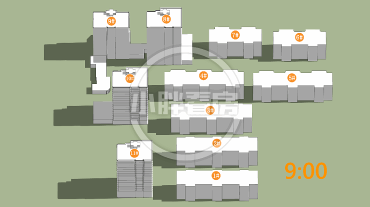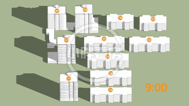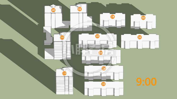 冬季:11#采光优异几乎不存在遮挡。10#低层受遮挡。就具体遮挡时间而言,10#主要在中午受11#遮挡。