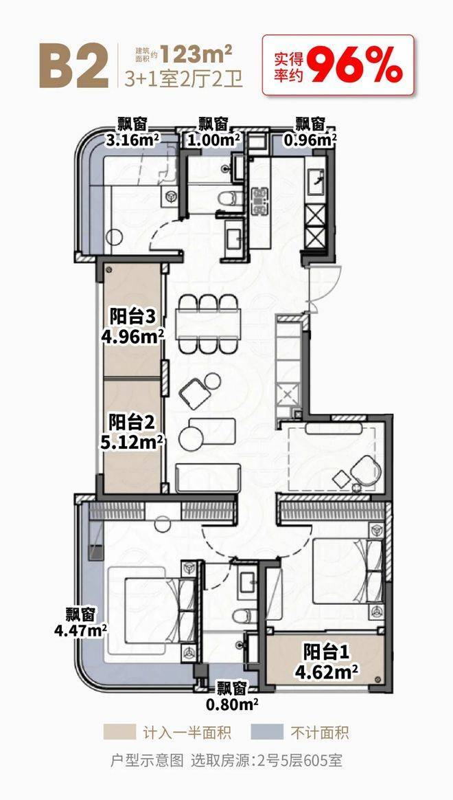 建面约123㎡4房,三阳台面积达约14.7㎡(赠送一半),5飘窗赠送高达约10.4㎡,室内使用面积约117.8㎡,实得率高达约96%,总赠送面积相当于两个次卧。
