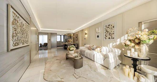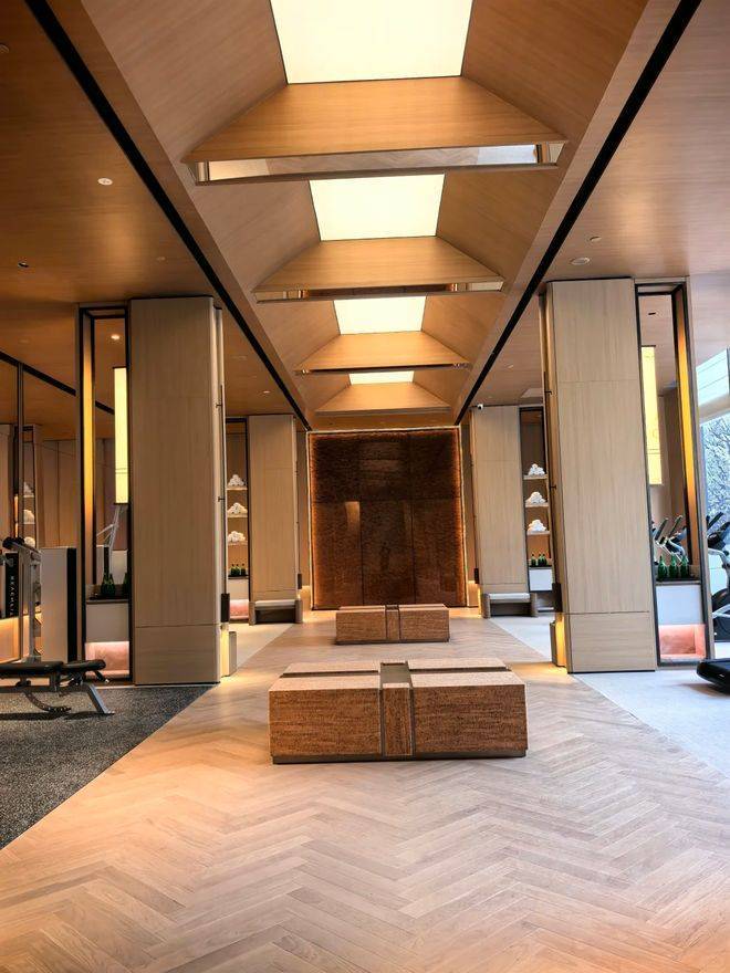 项目配备近6000平方米的室内外一体化会所,涵盖恒温泳池、健身房等高端功能区,并设有童玩、运动、社交、阅读等五大主题架空层泛会所,整体配置堪比千万级豪宅。高达8米的菱形网格顶四季花厅,复刻酒店的通透奢华,扶梯、电梯与艺术楼梯构建交通中枢,将酒店礼仪空间转化为住宅高效动线枢纽,实现美学与实用的完美融合。绮丽大堂以石材拼花与木饰面相得益彰,延续酒店材质碰撞的设计逻辑,中和冷硬感营造归家温暖,兼顾耐用性与舒适度,让仪式感与归属感并存。