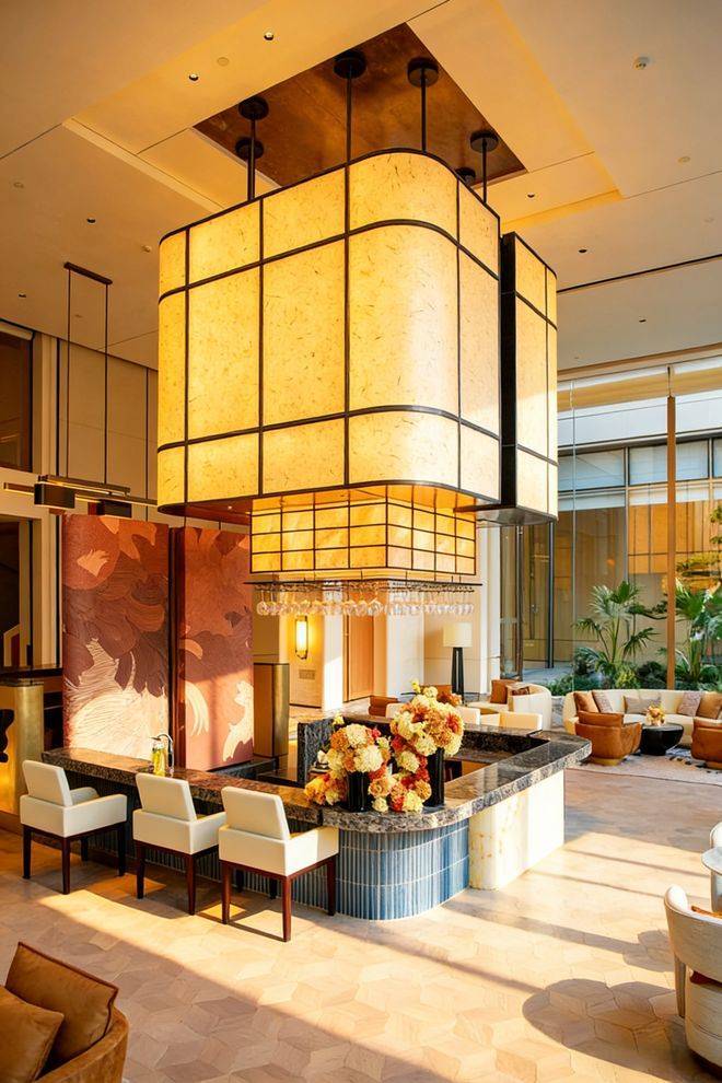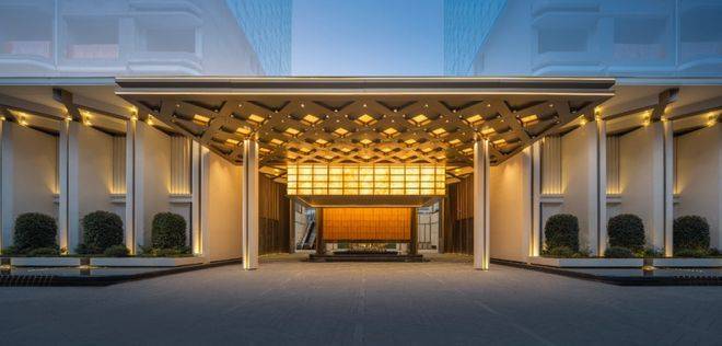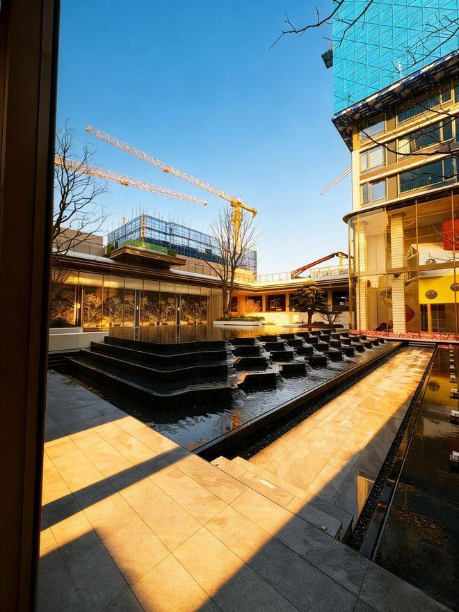 社区主入口以伦敦梅费尔瑰丽酒店为设计原型,打造了气势恢宏的酒店式门仪,200米宽的酒店式门仪,近7米高檐口,16根柱廊排成序列,步入其中宛如穿越高端酒店的入户长廊,气场瞬间拉满;点睛之笔「明瓦灯笼」,近10米宽、6米高的巨型光影装置,金色雨棚与玉石纹理透光材质巧妙衔接,下方是粼粼水景,光影流转间,直接点亮归家的仪式感。