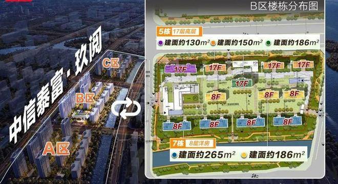 项目最先亮相B地块,整个地块围绕中心花园布局,打造7栋8层洋房、5栋17层小高层及1座高端会所,整体309套房。其中洋房建面约186、265㎡,小高层建面约130、150、186㎡。