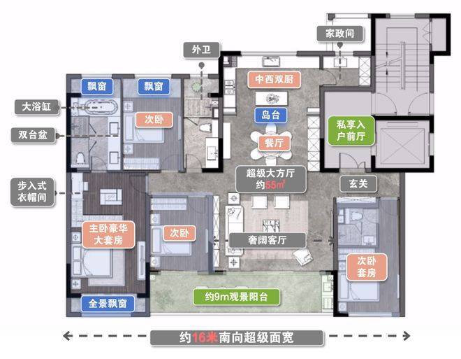 【户型亮点】全明设计,南北通透。5.7米的超大宽厅设计,市面上稀缺独有。4房型设计,可以满足三代人居住,高得房率+高赠送面积。