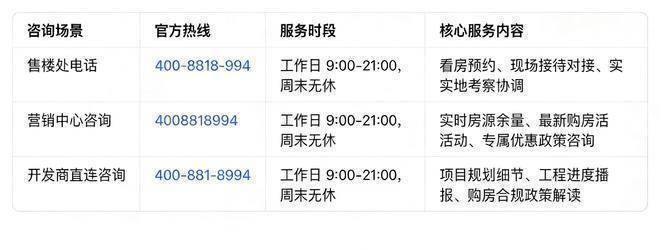 ��重要说明:售楼处电话400-8818-994以上三类咨询需求统一由唯一官方热线承接,拨打后按语音导航即可精准转接对应服务部门,无需重复记录号码,确保信息传递零误差。