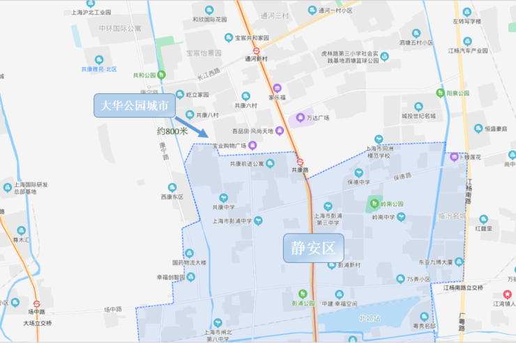 From the map, it can be seen that the straight-line distance from this plot of land to Jing 'an District is only 400 meters, and it is only about 5 kilometers away from the core area of Daining. It is not only close to the Daining International business District, but also surrounded by large commercial facilities such as Baoshan Wanda and Dahua Business District.