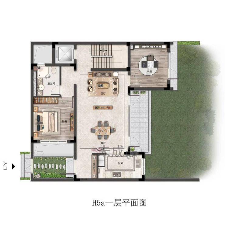 一层主要作为会客功能。样板间将一楼书房空间打开,与餐厨空间相连,更显空间感。还贴心设计了一个父母房,方便老人起居。