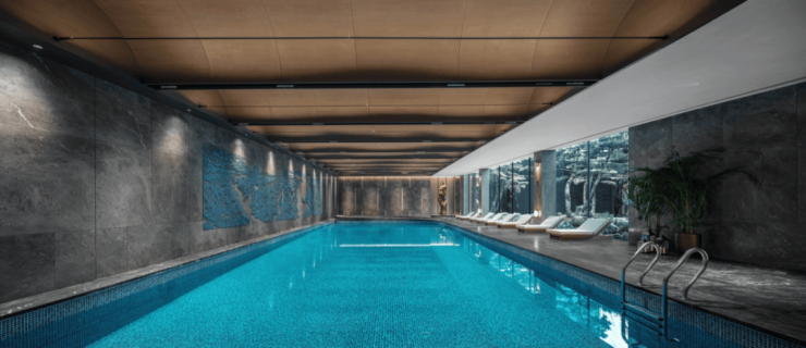艺术泳池,对标高奢酒店设计标准,配置恒温泳池及标准化赛道。半弧形顶面造型,竖向抬升空间高度,结合着柔和的灯光氛围,营造一个舒适的游泳环境。空间内陈设《寻回》雕塑,流动的运河形态,与空间保持一定的均衡与融合感观。