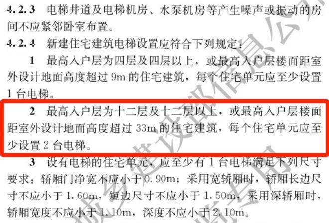 ② 5.1起执行住宅新国标,最高入户层为十二层及十二层以上,或最高入户层楼面距室外设计地面高度超过33m的住宅建筑,每个住宅单元应至少设置2台电梯。