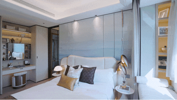 客厅是活动的核心区:约7.5米的面宽够阔绰,周末约朋友来聚餐,能摆下10人桌的长餐桌,业主可以在270°环幕窗边直面百万方绿地的风景,孩童的笑声和窗外的鸟鸣混在一起。阳台和客厅打通后,视野直接“连到”公园,早上跑完步站在这里喝咖啡,能看到晨雾从树叶间散开,这种“把公园搬进家”的体验,在中环很少见。
