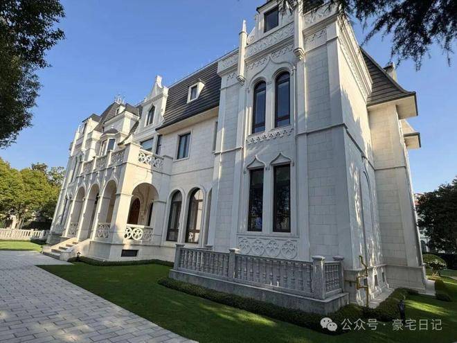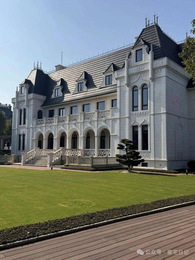 浅米白石材立面,搭配深灰坡屋顶,经典的老虎窗与雕花栏杆,复刻着法国贵族的仪式感。