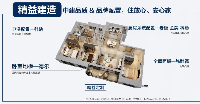 装标方面,厨房施耐德面板配置+金牌上下柜+全球知名厨卫品牌科勒水槽、龙头+中国厨房电器先进品牌老板油烟机、燃气灶+燃气具专家万和热水器。