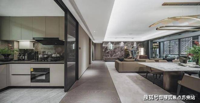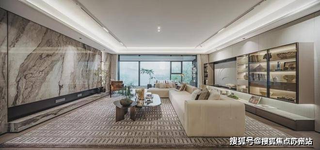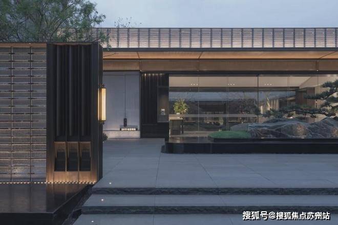 保利姑苏瑧悦取法苏州园林的廊桥框景线条美学,演绎为框体线条造型和简洁舒展的立面肌理。在地取材,运用质朴拙雅的御窑金砖,提取粉墙黛瓦的江南之色,定制兼具东方韵味和现代质感的蟒水纹。