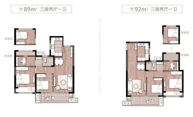 约89、92㎡的户型,2个户型的差别并不大,都是三房一卫、三开间朝南+双阳台的配置,这样的面积段能有双阳台还是比较少见的。