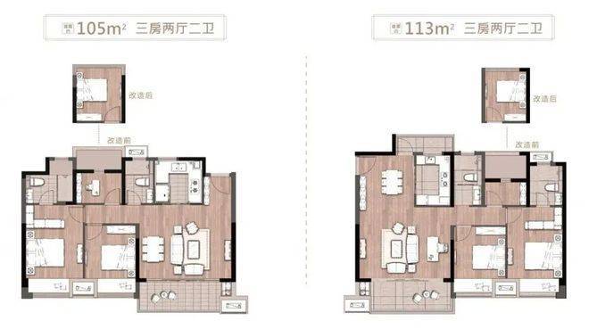 如果预算多一点的话,更建议上约105㎡、113㎡的三房两卫的产品,除了因为是两卫之外,还有这两个户型在小高层,按实得面积算其实单价差不多。