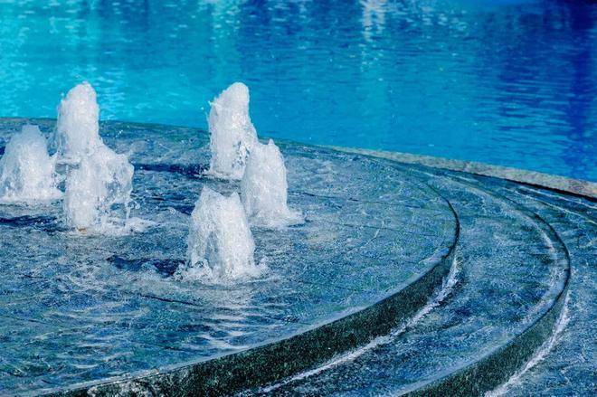 大量的玻璃幕墙+局部铝板等建筑元素的恰当组合,低密的纯洋房大盘在园区中央打造了颠覆性的“六翠之境”:目之所及是一片通透的蒂芙尼蓝,镜面泳池里波光粼粼,倒映着蓝天白云,是真正的“天空之镜”,与边上高大的棕榈树、白色的躺椅、繁茂的绿茵,彼此映衬,海边度假风油然而生。