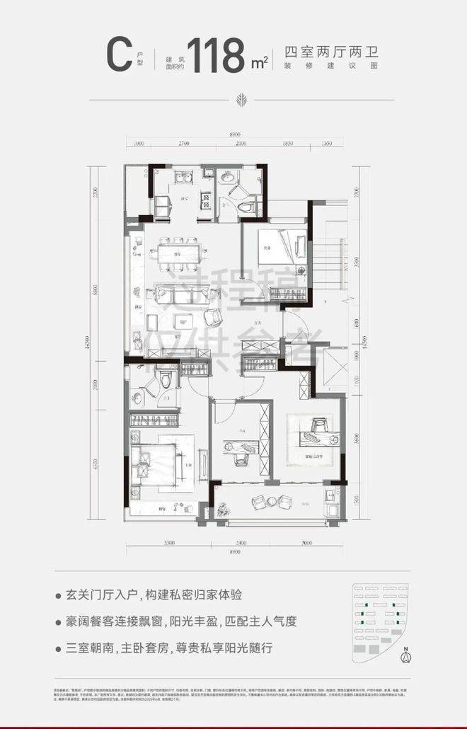 建面约139㎡也是三开间卧室朝南,1个卧室朝北,餐客厅竖向安置,属于当下最优化的大户型设计了。