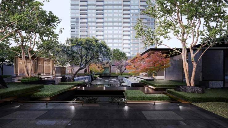 一园三堂的归家动线,象征着东方人文礼序。建筑风格造型,灵感源自金镶玉设计,提取其“曲”的形和白金配色应用到塔楼立面上,彰显项目的温和雅丽与尊贵典雅。
