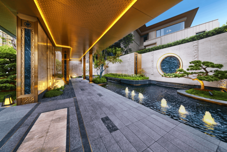越级产品的营造不光在美学馆,更在具象化的产品中落位。滨水著品建筑形态以新宋风形制,呈现出高级的“精致度”,外立面甄选宝格丽酒店同款保加利亚进口维纳多石材,大面积超白玻以及极致窗墙比设计,实现景观价值提升。