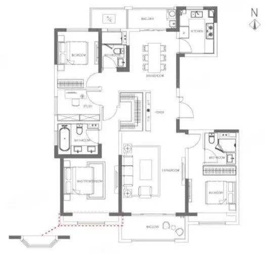 6号楼都是169㎡户型,4室2厅3卫1厨,开间和144㎡差不多,但是南北更长,还做了双套件设计。