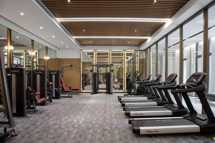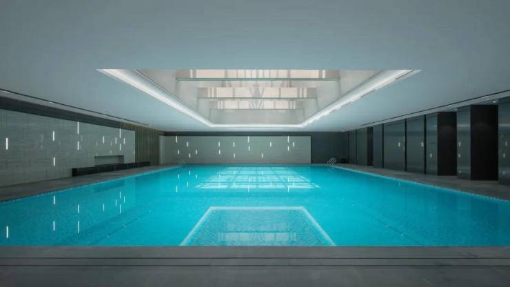 会所有约2000㎡,包括恒温泳池、健身房、瑜伽室等。恒温泳池长约20米,宽约13米。健身房分有氧区和无氧区,功能齐全。