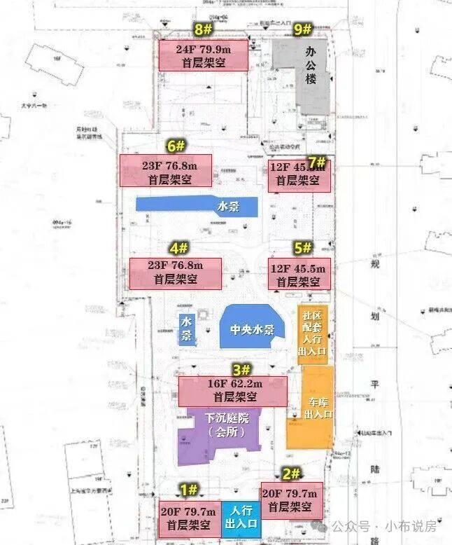 该方案亮点颇多,总计八幢高层和小高层设计,最南端的1#和2#楼均设置有私家泳池,而且还在19F采用了住宅楼当中较为少见的悬挑工艺,延伸出了一定的使用空间,个人预估这两幢会是配置大平层豪宅产品。