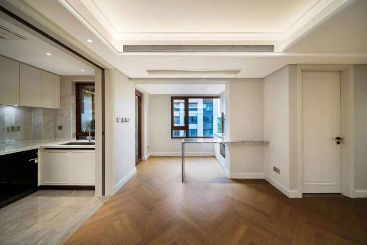 三大件齐全,其中中央空调为博世品牌。厨房油烟机、燃气灶、洗碗机、蒸箱四件套齐全,卫生间科勒马桶、台盆、花洒等。细节上:地面多为木地板,且用了人字拼。镜柜、卫生间储物柜等都在交付清单内。