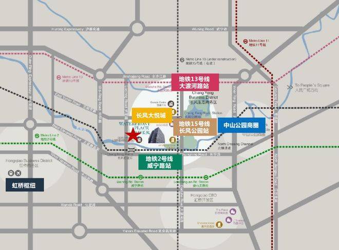 紧邻长风大悦城(150米)及国盛中心等商业体;教育配套涵盖金沙江路小学(公立,800米)、天山初级中学(公立,660米)及金宝幼儿园(私立,1.2公里);医疗资源包括上海市同仁医院(三级,2.2公里)及仙霞街道社区卫生中心(1.4公里);周边高端社区有中海紫御豪庭、雅戈尔长风8号等,并毗邻长风公园与苏州河景观带。