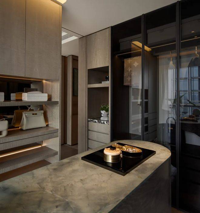 主卧大套房设计带超大主卫和衣帽间,面积约50㎡,尺度感与市面上近300㎡的顶豪拉平。