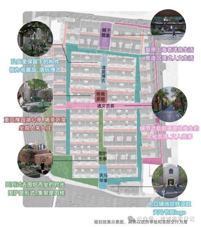 在社区的中轴上,弘安里植入记忆的符号与生活的画面,从入口处「天马华章」迈步前行,「围炉生春」「通文艺荟」「听泉茶叙」「清赏博古」贯穿到此次实景开放的「樾下雅集」,海派生活画卷昨日重现。