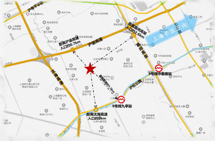 沪渝高速:本案距离沪渝高速入口约0.7km, 沪渝高速东至上海市中心西至青浦朱家角, 是上海西部进入市中心主要道路之一。